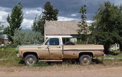 Rocky Mountain summer afternoon sky, daily thunderstorm on the way, and wind, with leaves showing white...+ old pickup truck...makes me miss the West.This from our correspondent. Michael C. Moore, who has work in a show opening this week at the George Lawson Gallery in LA:"This wasn't the best to be seen in La Veta, but old trucks are ubiquitous over there and I'll find some more in a week or so when we go back...