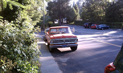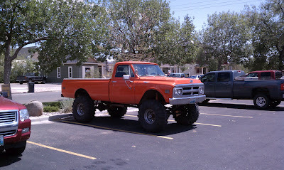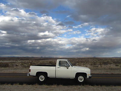 Pinto Canyon RoadTruck used to belong to City of Marfa. There's one like it--but a longbed--in a scrapyard out near the airport. This one was reasonably well-preserved for a truck that had been on the city payroll for twenty-six years or so. It has a 305 motor, despised by hotrodders--but I'm not. Ricky Rojo rebuilt the transmission last year. It runs a smooth 70 mph on the highway between Marfa and the skateboard park in Alpine. We drove the truck from Marfa down to Big Bend in January. Longest truck trip this year was to Odessa, in March, when I was interviewed on the local CBS channel about my new novel The O'Briens. Odessa was maybe three hundred miles r/t, and no problems. Hector Sanchez painted it in April-May 2011, during last year's terrible fire season. Hector is a volunteer fireman, and I think he was pulling some 24-hour days on the job, but he still got the truck done.
