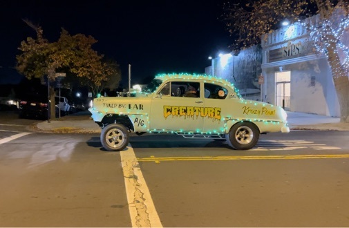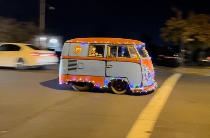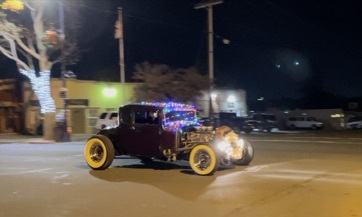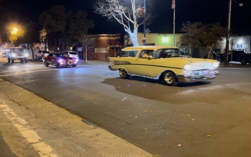 the rain, was the second [or third?] annual Benicia Christmas Cruise which as organized by Gairett Pirkig of Martinez wound its way through the decorated houses of the upper suburbs before heading downtown, taking First down and back before ending up at the Pizza Pirate in Solano Square. Being on H just off First allowed a pretty good if gaseous view of the spectacle… these are all screenshots from iPhone videos, so it’s quite rudimentary, but anyway…"