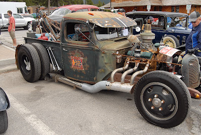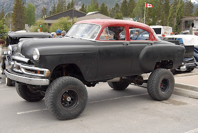 Our Alberta/Saskatchewan correspondent Alex Emond met this monster'd Pontiac at a show n' shine in Banff last weekend. I like the basic paintwork and the restrained style of the car. It may seem strange to be talking about "restrained" style when you're on 4 tires that large but the rattish Pontiac pulls it off, somehow. Canadian understatement, eh? It works.