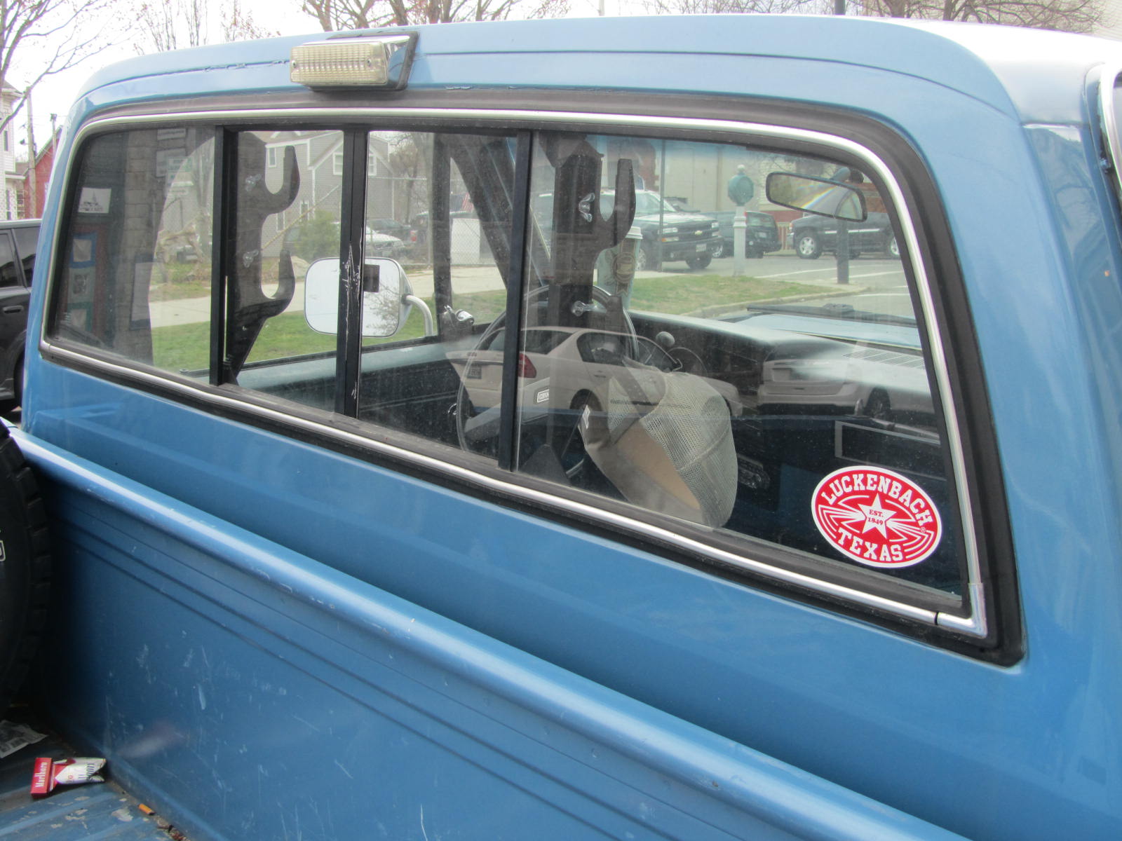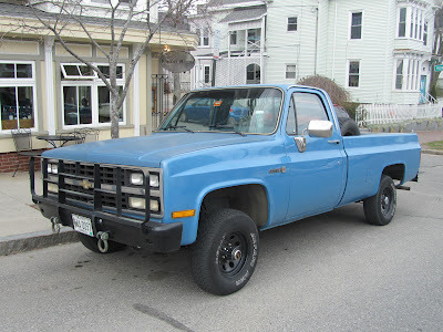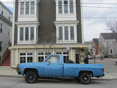 I've been seeing this truck this spring whenever I've been in the Munjoy Hill neighborhood in Portland Maine. When I'm in town I sometimes have lunch at The Front Room up on the Hill. The truck is a 1987 4WD Chevrolet with an eight-foot bed. The grill makes it look like a Texas truck; so does the gun rack, the lack of rust and, perhaps, the Luckenback Sticker in the window, though that might signify a wannabe.