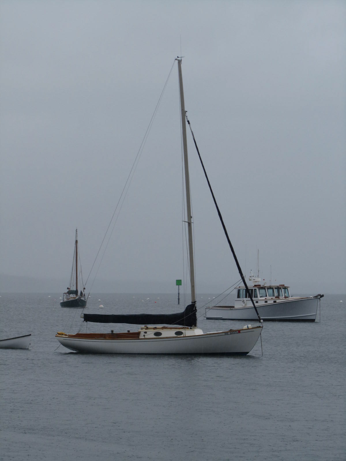 Down at Center Harbor it was very high tide, blowing, maybe gusts @ 18 knots, and steady rain. Boats are in but nobody has done much sailing yet. I hope Scout will be in within a week or so.