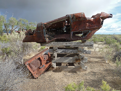 "Like most things in rural Nevada this little monument is shot full of holes - and that IS a woodrat nest up inside. True ratrod...or woodrat highrise? You be the judge."--MSM