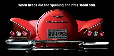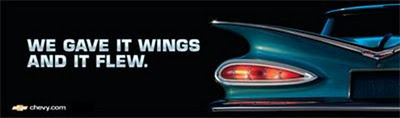 These billboards were up in Detroit during the auto show in early January. Great to see GM embracing it's heritage instead of driving away from it, too often in something like an Aztek. Can they come up with new cars as wild, dreamlike, & stylish as these bombers but translated into a language that makes sense for a planet waking up to global-warming?  Or has the moment, and the need, passed? Maybe GM and the car industry is no longer in the business of engineering dream machines. Maybe Apple does that for us now. Maybe its all in the cloud. Maybe if you really want to drive something with the crazed feline style of a '59 Impala, you'll have to find yourself a '59 Impala; otherwise, it's Volts,Volts, Volts.