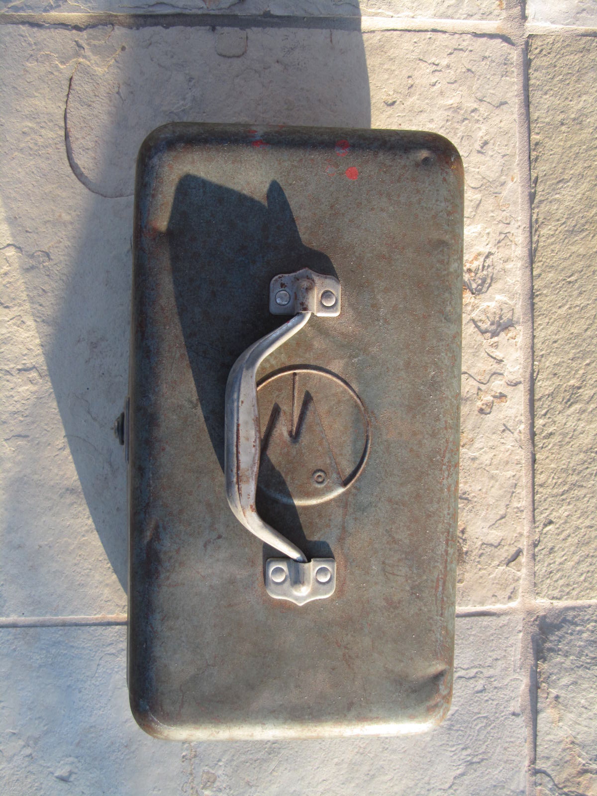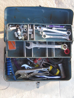 It is really a tackle box--see the fish head?-- but I use it to keep tools for work on the Custom Deluxe. Bought the box last year, for five bucks, at a junkyard on the east side of town. I am slowly assembling a collection of Texas tools. I'm learning it doesn't pay to buy cheap tools: and when I was at Liberty Tool in Liberty, Maine a couple of weeks ago, I longed to gather a hoard of good quality second- or third-hand mechanic's tools...but shipping tools all the way to West Texas didn't seem to make much sense.