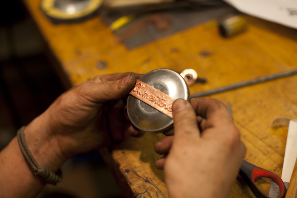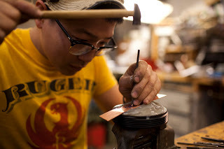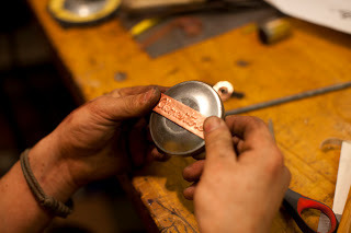 "We spent a full day in carbondale, illinois fueling up on biscuits and gravy and surprisingly good burritos and working on clementines custom flair. meers, the blacksmith, was to do a copper repoussé on the gas cap for the main tank.