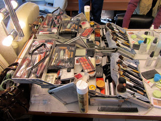 But back to LL Bean. As is the way with photo shoots, nothing much happened for a very long time while we waited for the late afternoon magic hour light that all commercial photographers seems to prefer. BB spent some time in the base-camp RV, getting make-up to make her look like some stylized version of an early 1960s mom. I don't think the art direction on this shoot was very accurate; she ended up looking, not early- but late- 1960s, in a very Jean Shrimpton-ish way. No one wore that shade of lipstick in 1962. But I like being married to a supermodel. I also admired the make-up tech's toolbox. There is something very moving and aesthetically exciting about the way professionals in any field arrange their tools.