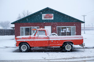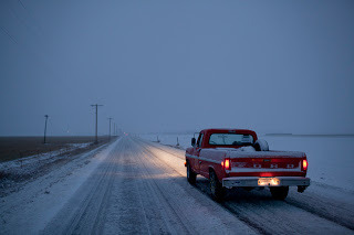 we wanted to hit some back roads. colby, kansas was our jumping off point after getting 300lbs of sand for the bed and sending some postcards. the studded tires helped a lot in the early snow, but after lunch it was clear we'd need the chains. for about 50 miles we were chained up on the rear end and crawled our way to salina, ks letting ambulances pass us by.