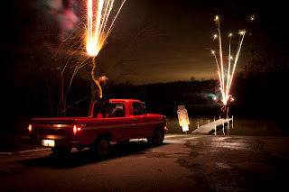 "I talked trucks with a machinist that meers knows and he'd noticed the differential was leaking a tiny bit. nothing serious, but worth adding some thread seal tape to keep it from leaking when i got home. he left for a while and came back with beers and some stainless steel screws and washers for my license plates as a parting gift. folks sure do like clementine. for a nightcap we took clementine down to the lake and lit off fireworks. it was grand.
