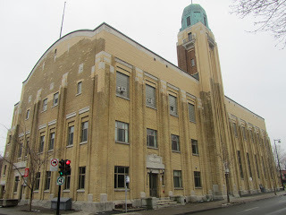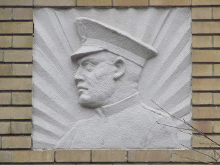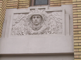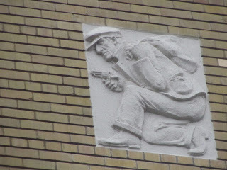 At the massive St-Henri police station/ firehouse, looking up, I noticed these bas-relief scenes of cops and robbers and firemen: