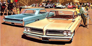 Always loved Pontiac ads from the early-to-mid-Sixties. The cars were stretched so wide and the people were so tiny. There's a good piece on the 1962 Grand Prix Pontiacs up at one of my favorite sites, jalopy journal