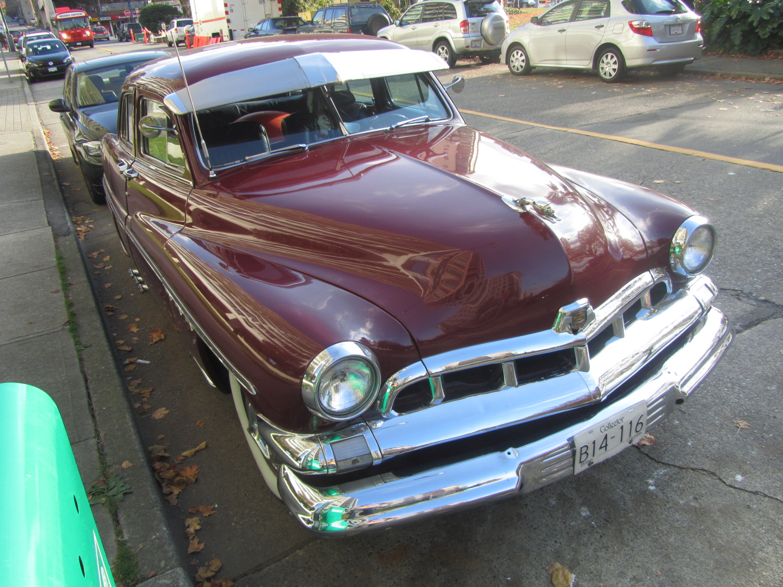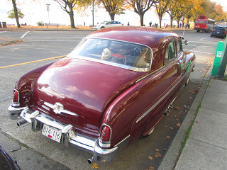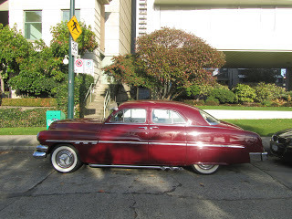 The Mercury Monarch was another Canada-only Ford model, and we just found one, parked out by English Bay, in Vancouver's West End. Best guess is that it's a 1951 model. Not an unrestored original, certainly. Nor is it a classic Mercury lead-sled. (See Autoliterate's post on Mercury Charlie) But it did look like a pretty cool ride, sun visor, fender skirts, suicide doors and all.