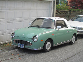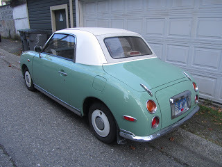 It had right-hand-drive, and a certain lustrous quality of fit and finish: Japanese cars sold into their home market seem to exceed the (pretty high) standards of fit and finish typical of the cars Nissan, Toyota, Honda, et al sell in North America. This is a Figaro, and it's a Nissan, though the Nissan nameplate is nowhere on the car. Nissan built and sold 20,000 in the early Nineties. They were originally intended for the home market but a bunch went to the U.K.. And imported Japanese specialty cars are quite a hot item on the Canadian West Coast, apparently. You can learn about importing Figaros and other Japanese vehicles here.