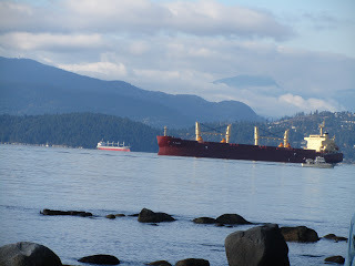 Whenever I'm in Vancouver, I walk the path along the seawall in Stanley Park, missing Maine and reconnecting with the idea of ocean. There are always bulk carriers parked on moorings out in the Bay, waiting their turns to steam up Burrard Inlet and fill with coal, wheat, potash, etc. You can tell they're empty because they are riding high. And there are more of them out there than usual: I wonder if the declining economy and the drop in commodity prices has slowed international trade? China isn't as hungry for Canadian raw materials this year as it was last year.When I see the ships out on English Bay, I'm always reminded of lines from Bruce Cockburn's Wondering Where the Lions Are: