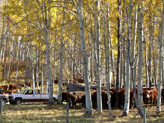 Strands of my own personal connections to Alberta: When I was 18 I came out west on my own steam and found a job as a hand on a cattle ranch in the Rocky Mountain foothills. I ended up going back for another season, and learned there most of what I know about horses and cattle, hayfarming and fence mending and small town beer parlours. I also learned just what I could and couldn't do on my own. The photo above was taken near Caroline, Alberta a couple miles from the GH Ranch, where I worked. Fall roundup was happening. I remember how tough it was working cattle in those aspen groves: not exactly the wide open range. But the forest is good cattle browse, and our cows were certainly free-range, and organic as hell.