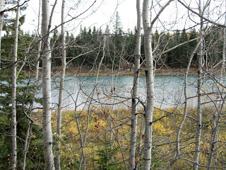 Today the wind was blowing maybe 20 knots NW, (ref. Ian Tyson: those winds sure can blow cold/ way out there). Classic Alberta autumn, and the sky was mostly clear. Down south the aspens were still blazing yellow but closer to Edmonton things were starting to look bare. I stopped at Rocky Mountain House, and walked the bank of the North Saskatchewan River, and through the site of the 19th century Hudson's Bay Co. (and Northwest Company) fur trading posts. I think the No. Saskatchewan may be the most beautiful river on the continent.