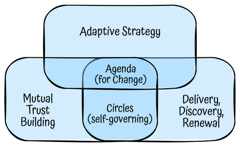 Co-creation – To keep finding better options, togetherSensemaking – To make the best sense we can of every new challengeTrust Building – To build trust in every directionThose first three commitments correspond respectively to the three top-level components of the Deliberately Adaptive Organisation [1, 2]. These are the overlapping and deeply-connected “supersystems” of Adaptive Strategy, Production (Delivery, Discovery, and Renewal), and Mutual Trust Building.