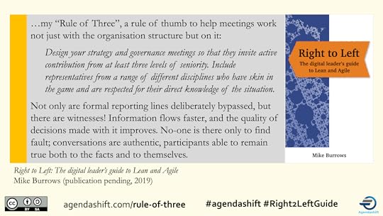 I mentioned my “Rule of Three” in answer to an important question about who should be invited to internal workshops. I had already written it up for my forthcoming book Right to Left but I was encouraged to put together a page for it with an easy-to-remember url, agendashift.com/rule-of-three.