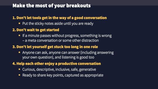 This final point brings together the three “Don’ts” into something more positive. A productive conversation is one that is actually happening, actually underway, everyone able to contribute in multiple ways. Part of “productive” is also to be able to relate key points back afterwards, but let’s keep that in perspective. Speaking to myself here (I still get this wrong), clarity from the host is especially helpful where the guidance is not what participants might be expecting. Especially in those more tentative early exercises, enjoy it. One way or another, the threads that matter will be picked up again.