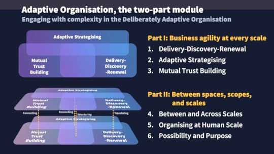 Day 1: Leading with Outcomes: Foundation – exploring what it means to lead in a transforming organisation, learning how to develop and pursue strategy in the language of outcomes and with high participationDay 2: Adaptive Organisation (I): Business agility at every scale – developing bottom-up a truly “every scale” model, the Deliberately Adaptive OrganisationDay 3: Adaptive Organisation (I): Between spaces, scopes, scales – attending to “between scales” issues barely dealt with in the frameworks or the literatureThe Deliberately Adaptive Organisation is my 21st century take on a 20th century model, Stafford Beer’s Viable System Model. Fittingly, a fractal model of organisation meets a fractal model of engagement, the former approached in a relational and constraints-based way, the latter replacing the engineering approach more typically employed. These two aspects combine to make something accessible, complexity-friendly, and practical.