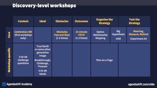 Leading with Outcomes: Foundation, chapters 1 & 2 (of 3) – as beforeDiscovery-level workshops – not only the classic Leading with Outcomes Discovery Workshop and variations thereof, but the Outside-in Strategy Review (OI-SR), understood here as building on Discovery’s basic structureAssessment-based workshops – the generic survey debrief and other workshops, some of which incorporate additional training content, for example a Reverse STATIK workshop [2] and the Adaptive Organisation Workshop [3]Moving into action – completing (as before) Leading with Outcomes: Foundation chapter 3, then delving deeper into Adaptive Organisation, possibly including (this is under development) a look at narrative enquiryDiscovery workshops can now be seen as choosing from the following:
