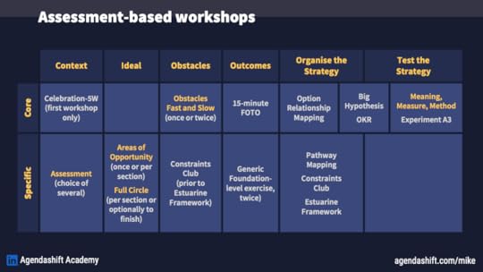 Leading with Outcomes: Foundation, chapters 1 & 2 (of 3) – introducing and applying the IdOO (“I do”) pattern, Ideal, Obstacles, OutcomesThe Leading with Outcomes Discovery Workshop – a high-level application of the IdOO pattern, covering the classic exercises Celebration-5W, True North, Obstacles Fast and Slow, 15-minute FOTO, and Plan on a PageThe Leading with Outcomes Assessment Debrief Workshop – the assessment, survey debrief, and Areas of Opportunity, then for a second time Obstacles Fast and Slow and 15-minute FOTO (both of those well worth the repeat), and finishing at Option Relationship Mapping, leaving the ideation part to session 4Beyond inside-out strategy – Leading with Outcomes: Foundation chapter 3, which covers the ideation part of the Assessment Debrief workshop left over from the previous session, followed by overviews of the Outside-in and Adaptive Organisation parts of the Leading with Outcomes curriculum and their related workshop offeringsThat structure has worked well enough, but session 4 can feel a bit of mixed bag. The new agenda brings forward some of that content, achieved by seeing sessions 2 and 3 less exclusively in terms of inside-out strategy and more as representing two families of workshops: