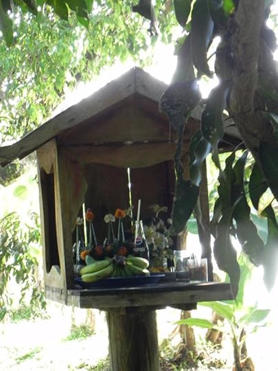 Spirit Houses can be found in many Southeast Asian countries. These small, often ornate, structures are generally placed on a dais or pillar near a family's home or the site of a business. The Spirit House helps protect the family or business and serves as a shelter for spirits, including those that were displaced in the building process. In my trips to Laos, Myamanar, Cambodia and Thailand, I've seen many Spirit Houses. They are filled with gifts to appease the spirits -- fruit, soft