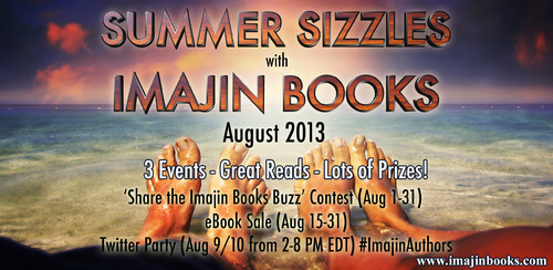 3. Twitter Party - for two days, August 9/10, we'll be holding a Twitter Party online and giving away prizes (ebooks and gift cards from Amazon and Kobo.) Join us by searching for #ImajinAuthors. Leave us a question or comment by including #ImajinAuthors in your tweet. The party begins each day at 2:00 PM EST and goes until 8:00 PM EST. Our authors will drop by when they can. Follow us at http://www.twitter.com/imajinbooks