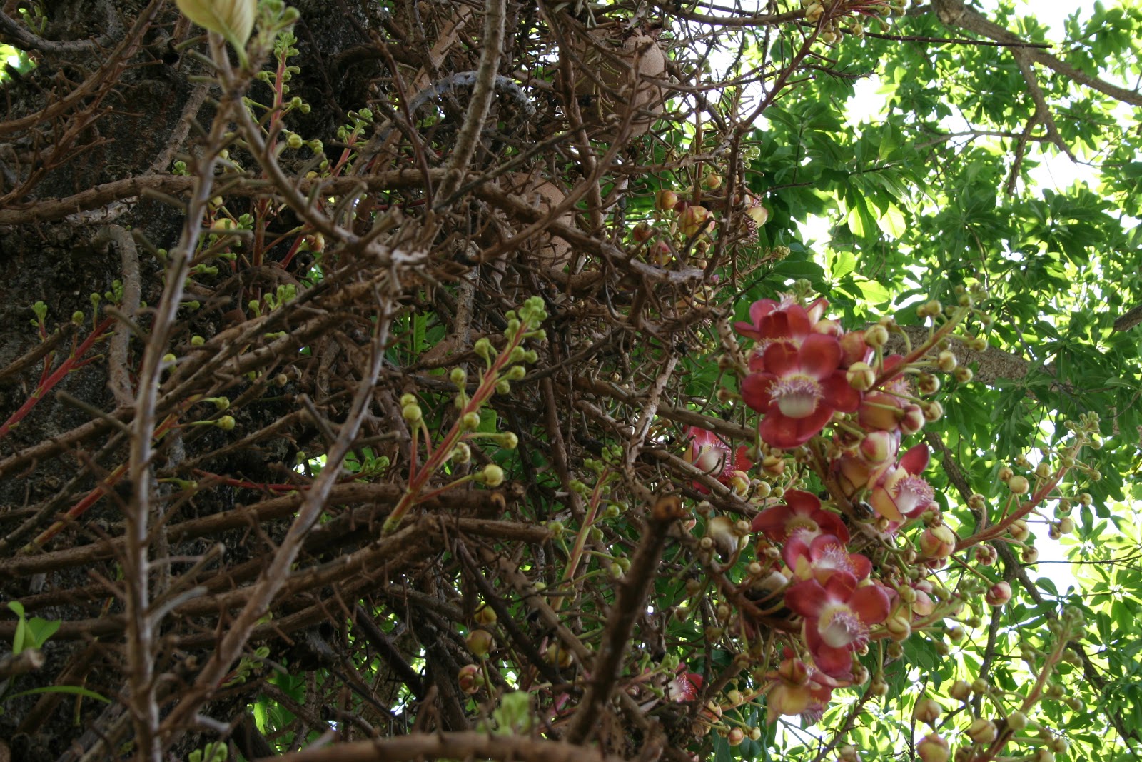 Inside the village circle, we stop by a gnarled tree whose roots curl upward, wrapping themselves around each other and the trunk like skeletal fingers. The flowers are little mustachioed faces. When the petals fall to the ground, they look like eyeballs. The gardener comes by and tells us this is the cannonball tree. He points to one of the cannon balls; it looks like a coconut, but it’s not edible. Used for medicinal purposes instead, they sound like cannons when they hit the ground.