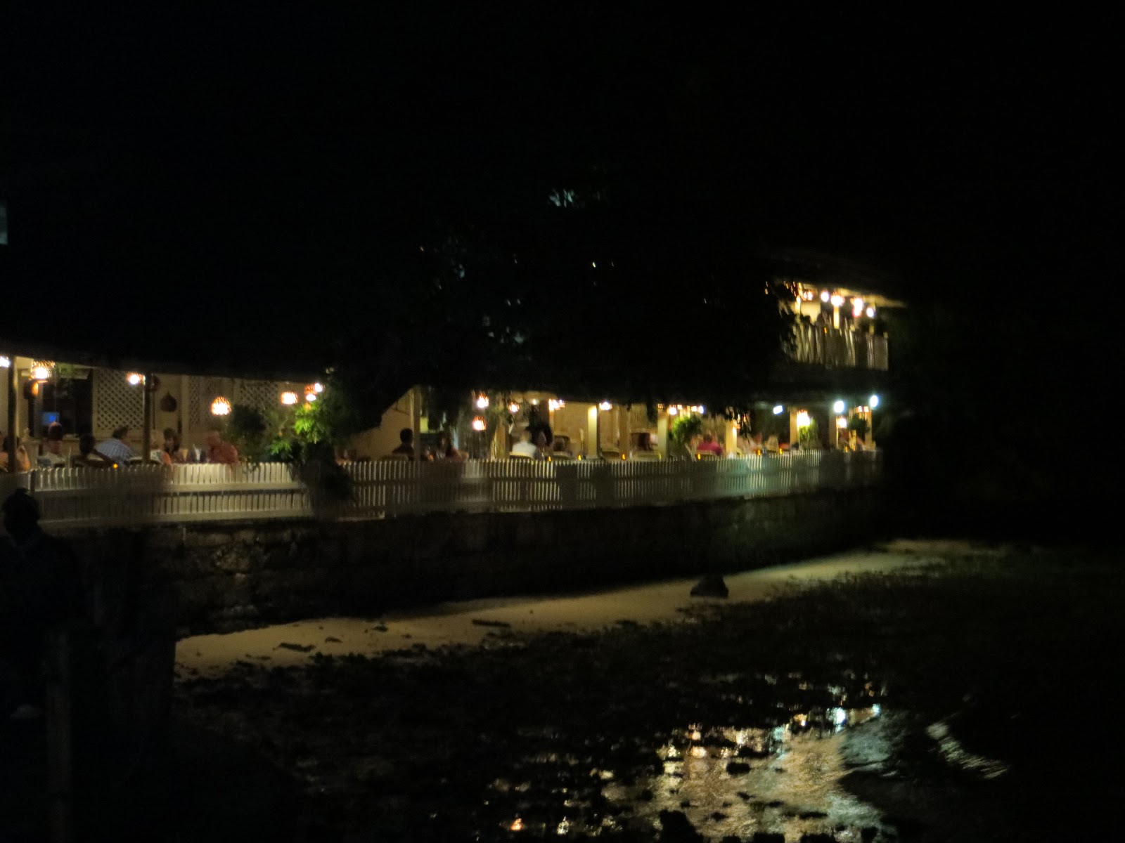 Tonight is a perfect, round, white moon. Oneal picks us up for dinner once again and we traverse the island once more, it seems, to reach Daphne’s. The place is beautiful. Constructed of light brown wood, the balcony reaches out over the shore. Our table is exquisite, sectioned off from the others, private and lovely. Our meals are excellent, but we have to admit: not as creative or lively as Pisces. However, they do present Cugina with a firecracker candle and a chocolate-engraved Happy Birthday dessert.