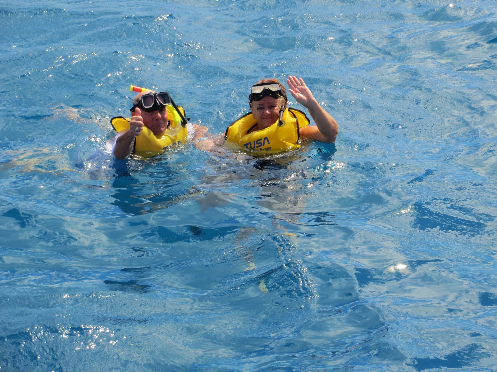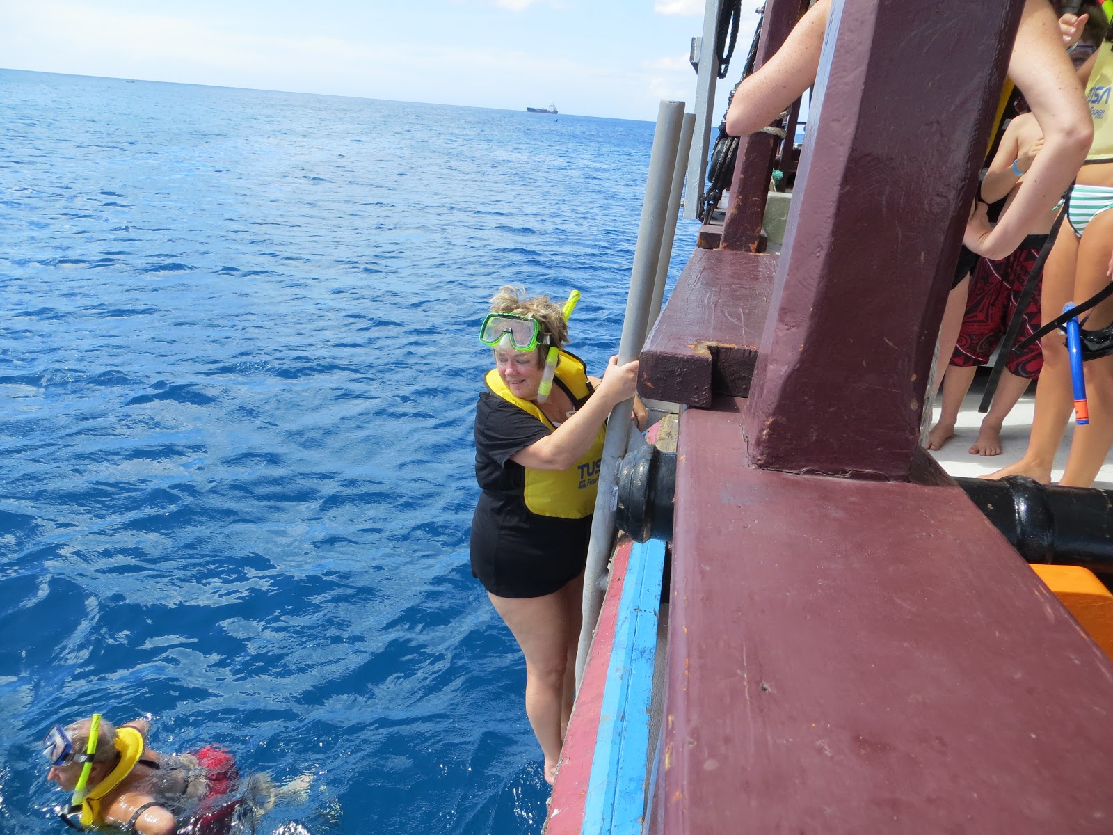 Our next stop is a snorkeling swim with the turtles. One of the crew brings a bag of fish that entices the huge turtles to come close. I stick close to him as he feeds one, then two, then a third little one. He is able to encircle one of them with his arms; she almost hugs him, then he coaxes her closer to me, where I can pat her head and feel her rocky shell. She blinks at me lazily, interested only in what there is to eat. It’s such a thrill.