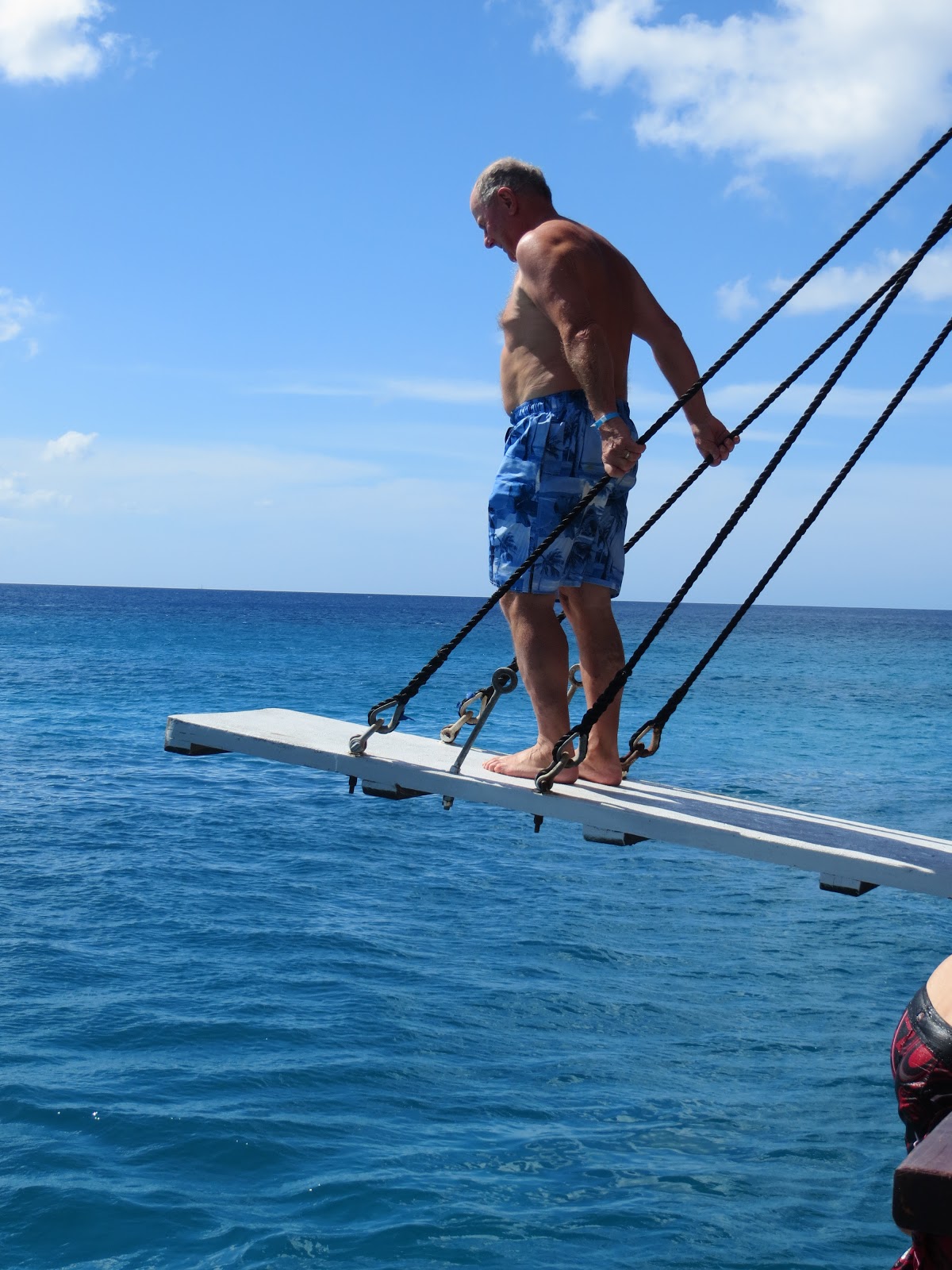 Later we do all the crazy stuff. First, Dennis and I each walk the plank. When you get out onto the end of the board, it’s a bit wobbly, but you’re too embarrassed to turn back, so in you go. Now I can actually say it was fun! Next comes the rope swing. At first I’m too scared, but we’ve met a couple of women from New York, Maureen and Julie, and they talk me into it. That turns out to be a riot, too.The return sail is gorgeous: breezy, easy, and somehow everything is funny. We dance on the deck, laugh, Dennis and Wendy take tons of pictures. There’s even a revival of necking! An absolute blast is had by all.
