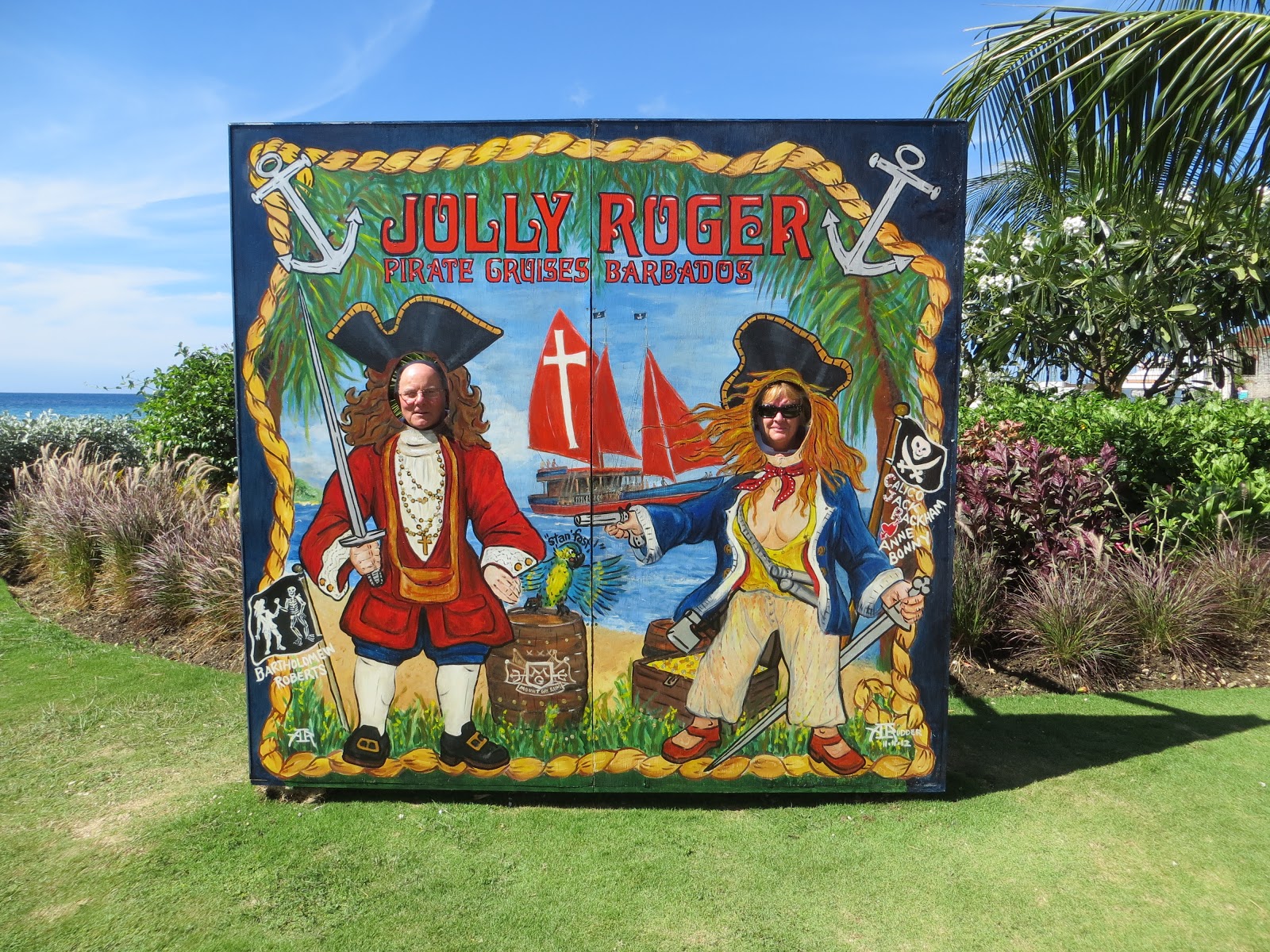 Keisha relates the fact that all people brought to Barbados used to go through Pelican Island. During an outbreak of cholera, sick people were banished to that island until they recuperated (or not, presumably). Now the water separating the small island from the big one has been filled in and forms the harbour from which cruise ships – and our Jolly Roger – come and go. There’s an herb garden just outside the living-room window, where a soft breeze flutters the curtain. Two birds, which we can’t name, strut through the bushes. We are fascinated by the gentleman’s chair, the judge’s chair, the 1950’s radio that still works and is playing Bajan music. The oldest piece of furniture, built in 1696, is called a “settle” and is made of dark oak, with exquisite carvings. Keisha shows us the indoor washroom – it’s an original Thomas Crapper! Outside, we find lovely bricked pathways, which Keisha informs us were made from the bricks of a fallen sugar cane tower. Now I discover what those brick towers that dot the landscape are! They were the chimneys that let off the steam from the sugar process, which looks pretty complicated to me. Keisha says the plantation stopped making sugar years ago when a huge company took over most of the business on the island, but they’ve started again, producing a small amount for tourists and personal use.