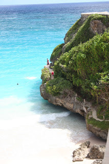 By three o’clock, we’re bobbing in the silky warm water. This is the most amazing sea we’ve ever been in, we say; even Maire would approve of the temperature. It’s an easy, lazy bay, the waves are gentle, swelling just enough to be interesting. The azure inlets are surrounded by white limestone rock and sand, dotted here and there with volcanic remains. We walk from the left to the right beaches, the plantation-style porch and restaurant above us, cross over a rocky formation, and I look back away from the sun to see my footsteps in the white sand.