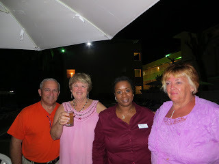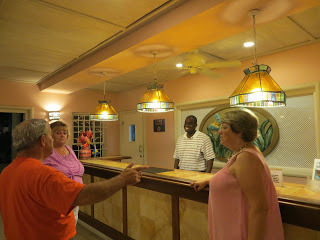 Once again we head to The St. Lawrence Gap, this time to a restaurant that sits out on a pier of rock. Appropriately called Pisces, it’s a lovely place. We are led to a beautiful table that looks out at the harbour lights, where we can hear the waves lapping against the shore. It’s a stunning sight. We proceed to have the best dinner ever. It even tops Café Sol. Jamal comes to visit our table and the service could not be better. I have the most delicious sea food and Vince has a steak that he says was “worth the whole trip”. Wendy and Dennis ooh and ahh over their meals as well. Afterward we stroll the Gap a little bit. It’s a lot quieter tonight, though one “vendor” makes a quip that becomes one of our favourite lines: “I’m selling what you’re smelling.”