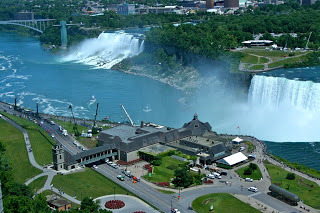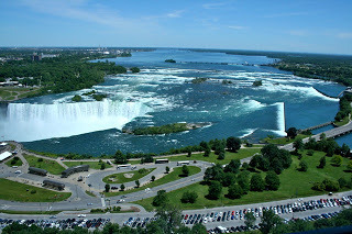 It’s a gorgeous, sunny day, warm but sans humidity. Perfect for walking and sightseeing. The hotel room is on the 29th floor, so we can see up the Niagara River, all across the Canadian Horseshoe Falls in front of us, and the American Falls to our left. The flow of the water is staggering. The currents pick up speed as they head for the canyon, ripple over rocks and eddies, then pitch themselves over the sides. From this height, the horseshoe is spread at our feet; it feels as though we are moving when we peer through the bottom glass. Waves and swirling pools are juxtaposed with the tidiness of artificial walls and dams that direct the water forward. This time of year, the vegetation is so lush! All the shades of green, lime and lettuce, frame the white and blue of the river. And today the added glory of a clear sky dotted with white and a view that extends for miles.