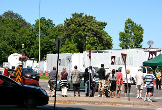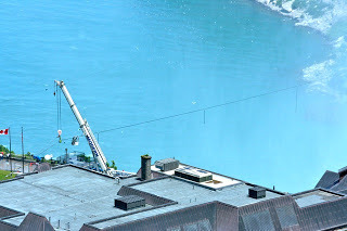 We’re here, as it turns out, on an historic occasion, though in my point of view it’s a dubious one. Nik Wallenda will walk over the falls tomorrow night. A tight rope is strung across the water from the U.S. to Canada. Apparently Wallenda will take about 40 minutes to make the trip. ABC, CTV and Global trucks already line the street where he will alight. I look up some stuff. The Wallenda Family started out working for the Ringling Brothers Circus in the 1920’s. Despite all kinds of death from the high wire (they seem to kill off in-laws in particular), the tradition continues. Nik started walking on tight ropes when he was four. His great grandfather died on a walk in Puerto Rico between two hotels. Nik and his mother have since completed that, stopping to pay the old man homage at the point where he fell. They show the clip a few times on television of the poor guy grasping at the wire and then flopping out of sight. They also show the family’s fall from their signature pyramid trick, which killed off those afore-mentioned in-laws. Nik’s ultimate goal is to cross the Grand Canyon, so maybe this Niagara trip is a test case. They expect 120,000 people to gather here tomorrow night, so I’m glad we’ll be leaving. Not to mention the audience who will tune in to see him on television. This feat is going to cost nearly a million and a half dollars. Wouldn’t that money be better spent on something worthwhile? Like a planeload of food for starving people? I dunno – saying this is historical when a guy is risking his life in front of us all – I’m just not a fan, I guess. I do get some interesting facts from the Internet. 184 feet is the height of the escarpment. 740,000 gallons of water per second go over it. It’s 12,000 years old. There will be 1800 feet of wire for Nik to cross. We take a walk in the warm but breezy day. Next door is the Loretto Christian Centre, which brings back a lot of very pleasant memories of retreats with Kitty and others. The walkways are still traversable, though there are lots of people around – can you imagine what it will be like tomorrow? We descend the hill, our skin sunshine warmed, so when we reach the falls, we welcome the mist. The roar of the water out-shouts the crowds and the vehicles cruising the roads. I never tire of this sight. This natural wonder of the world, so close to where we live. The rush of the water is overwhelmingly inspiring. It makes me want to write! We stand and stare and let the sun and water spray us simultaneously. As we walk along, we get closer to the site of Wallenda’s stunt. Somehow we can’t help but get caught up in the excitement. Vince takes pictures of the enormous cranes and lights and film trucks crowding the area. It’s our love of the movie/television business that propels us, I think. Draws us into the sheer spectacle of this event. We figure out how the camera will follow Nik along the wire. Watch the crew set up. Try to guess what role the two young women atop the platform play.