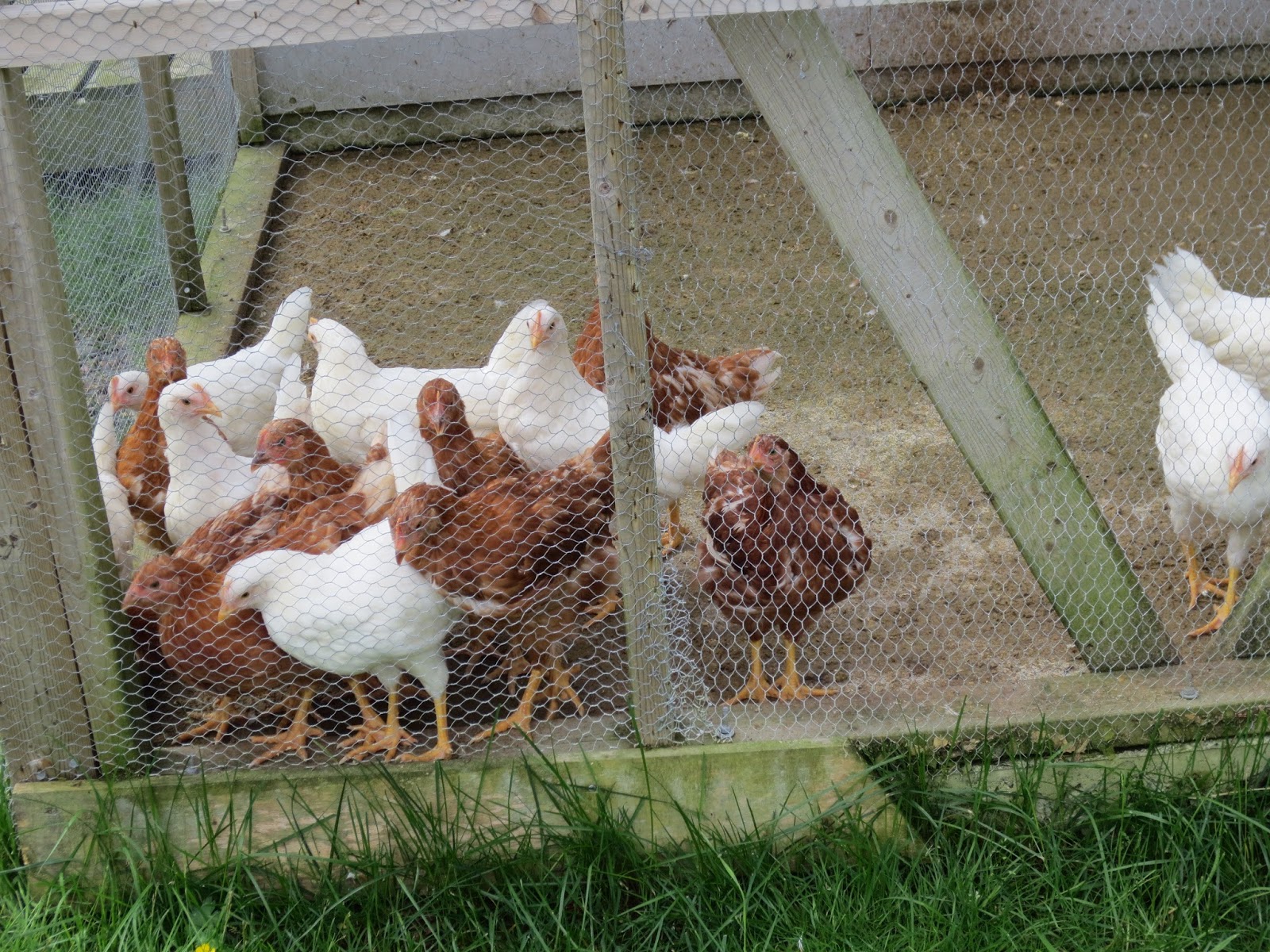 The chickens think we've got food for them. They still peep like babies, since they're very young.