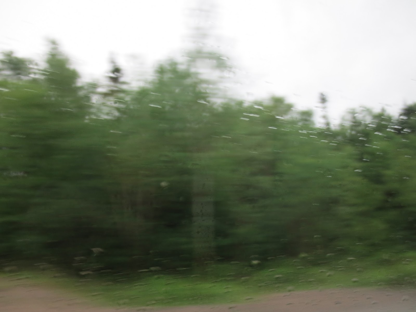 We’ve entered the high rock hills and thick forests again. Bent over in the wind, the trees arch themselves against the driving rain. Rivers flow hard and full. The sea throws itself onshore. Water puddles on the roadsides and roars up from under the wheels of our car. In here it’s dry and quiet as John fights the streams and ruts that have become small ditches of rain. Ironically we’re suddenly in Swift Current.