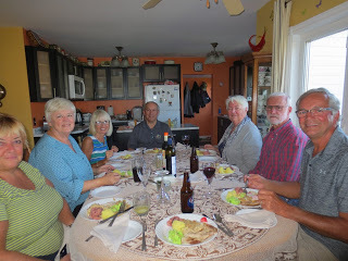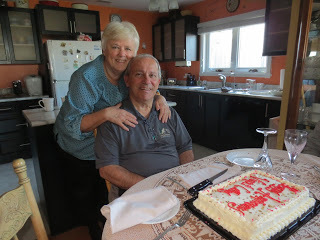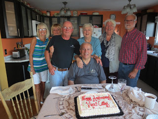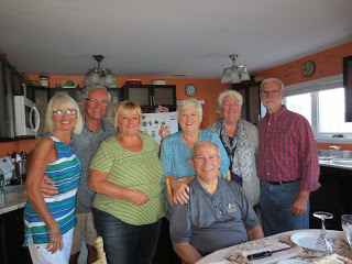 When we finish the drive, we're a little tired, and have time only to brush teeth, powder underarms, and get back into the van. Judy and Paul Gill (Dennis's sister-in-law and brother) welcome us into their lovely home overlooking the sea in Botwood. They treat us to great conversation and fabulous food - Newfoundland salads galore! For dessert, an amazing surprise: an anniversary cake. Carrot, of course, as my Cugina knows me well. Of course it was Wendy's plan, but Judy kindly carried it out.