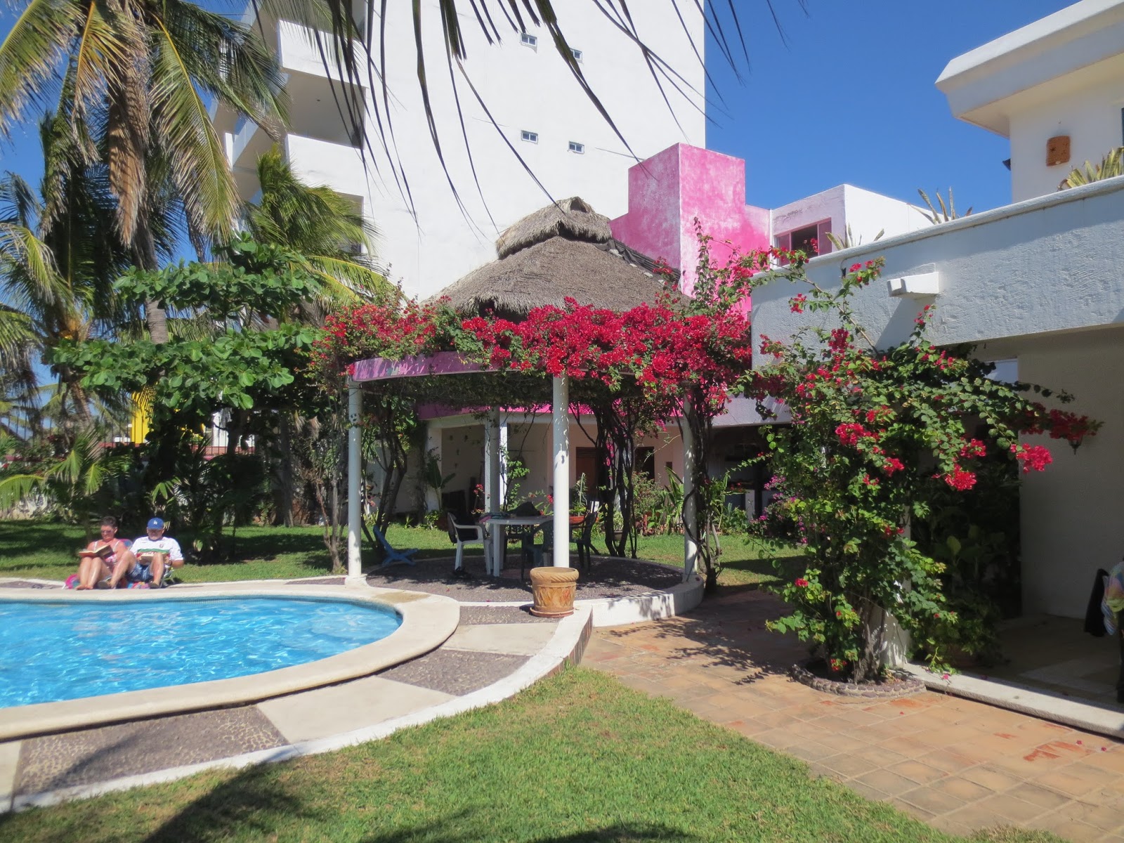 The hacienda is a wide, lovely property. Right on the Pacific, there are coconut palms and many different flowering bushes everywhere, colored rocks and green grass. Directly in the middle is an inviting kidney-shaped pool. A little round gazebo has been constructed with leaves and vines on concrete pillars.