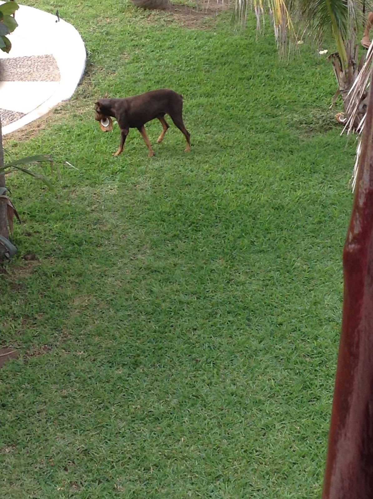 Next one of the dogs comes wandering into the apartment, since the doors were open. Vince is not very comfortable with Rambo, so I lead the dog back downstairs, talking to him with my cat voice, telling him he's a good boy, which I realize he probably doesn't understand since he only speaks Spanish. However the cat voice gives the message anyway. He becomes my friend and lies beside me as I edit by the pool.