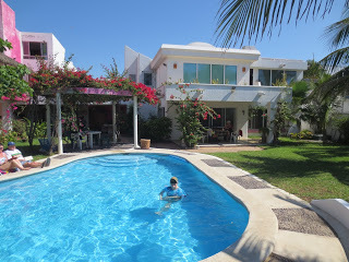 We spend all day in this mode. Relaxed, quiet. Reading, blogging, talking and laughing now and then. Dip in the pool to cool off, stretch the limbs. Watch the ocean for a while as it swells, breaks, retreats. Listen to Grackle tell us the news.