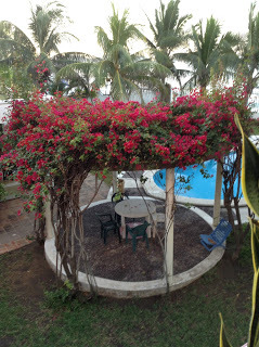 A lovely hummingbird flits in and out, tasting the red flowers of the bougainvillea.