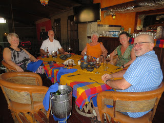 At sunset, we walk down to the Toscano Restaurant. Pat and Bill have secured a beautiful table overlooking the ocean. Unfortunately the sun sets in a bag, so we don't get treated to the usual stunning sight. Our food is mostly good, the wine is excellent, and there's a musical duo who play and sing songs that I know the words to. Isabella and Jorge, with Rambo or Rocky, jog by on the sand.