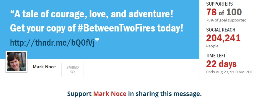 The outpouring of support for my Thunderclap campaign so far has been awesome to say the least! Thanks to everyone who has signed up so far! We're already over 75% of the way toward reaching our goal!But I still need your help to make it the rest of the way before this month's deadline of August 23rd. If you haven't signed up yet or you'd like to share the link with friends, please join my Thunderclap campaign here.