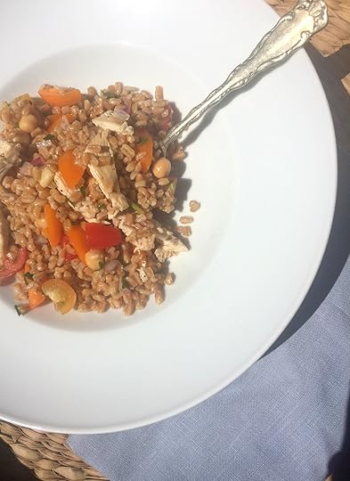 In the same sauce pan that the farro is in, toss in vegetables, chickpeas, herbs and dressing. Mix until all is equally distributed and enjoy. You can also reserve the chicken and place it on top of the mixed farro salad.