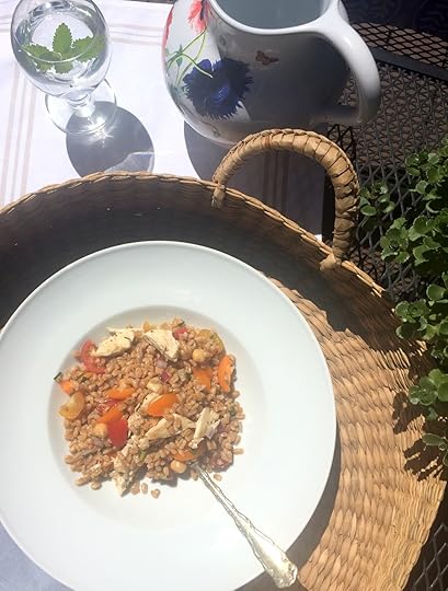 I then went out to dinner last Friday to The French Market and chose their Farro Salad with avocado and tomatoes, topped with a poached egg. Exquisite. And that was when I realized, farro is just a whole grain to mix with what you love. Choose a dressing (I have made a simple vinaigrette, but you can just use olive oil as David Leibovitz did), chop up what you have in your refrigerator or your garden (I just tossed in my extra chickpeas because I didn’t want them to go to waste and chose purposefully the other ingredients) and enjoy.