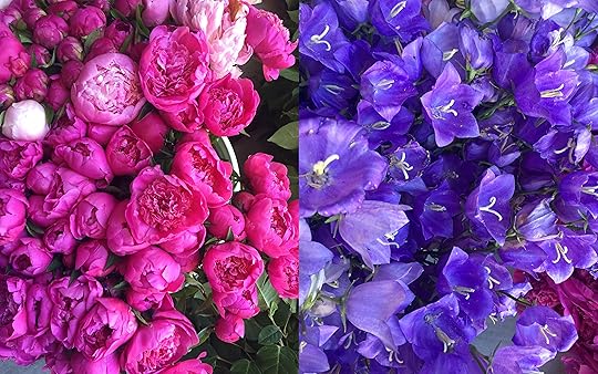 ~peonies (left); campanules en français or campanules (bellflowers) (right)~