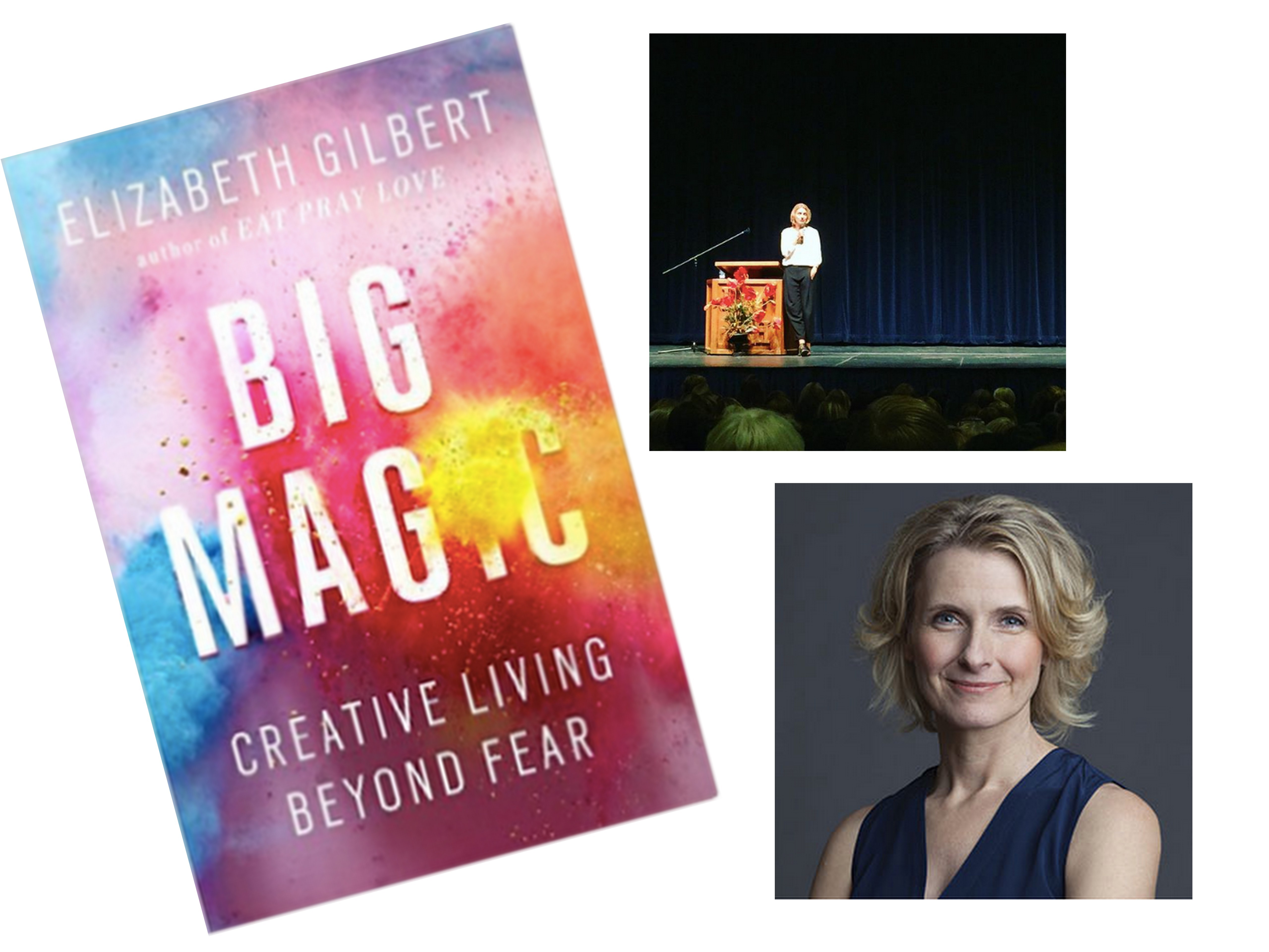 ~clockwise from the top: Elizabeth Gilbert speaking in Bend captured on TSLL instagram, the author Elizabeth Gilbert, her recent book Big Magic (released on September 22nd)~